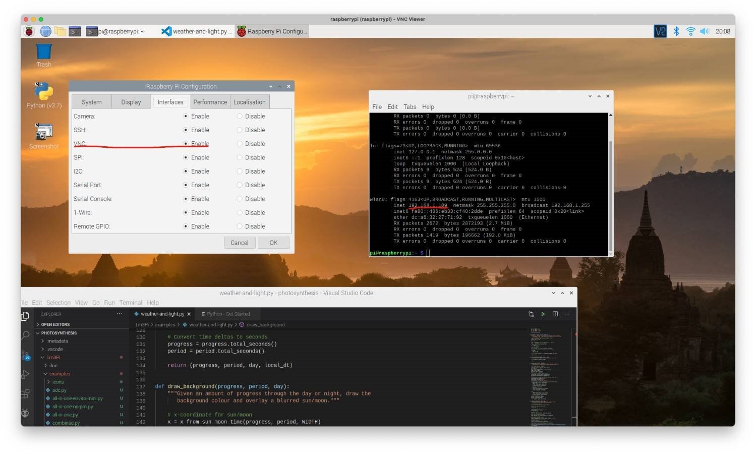 This is very straightforward thanks to Raspberry Pi Configuration. All we need to do are check VNC "Enabled" box and find out the IP address of this device. From my main computer, I installed a VNC viewer and established a connection to the raspberry pi using the same Wifi access.