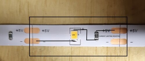 LEDs are typically 3-volt devices. What this means is that if a 3-volt differential is applied between the positive and negative ends of an LED, it will light up. The LED strips I am using is rated for 5V, this means I have a LED and a current limiting resistor connected as shown in figure below