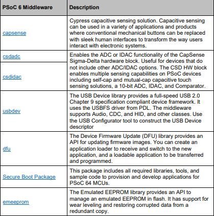 Middleware includes libraries that implement an API for a particular domain, for example capacitive sensing or an http server. A middleware library may be created by Cypress or come from a third party. Cypress-created middleware may use the Cypress HAL or an LLD directly. In that case, you need the corresponding driver library or BSP for the middleware to work.