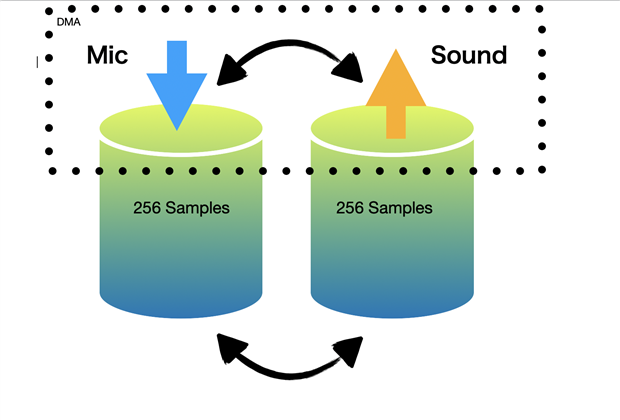 The CPU with two separate DMA direct memory access, our echo use both of them, which DM1 for Mic input and DM0 for codec, we also use the interrupt DMA to flipping the record and playback buffer. The I2S require stereo signal, we use 2D DMA at codec TX DMA, which every address will read twice before shift to other.