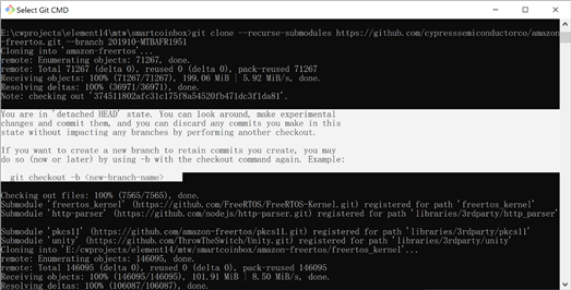 eg. git clone --recurse-submodules https://github.com/cypresssemiconductorco/amazon-freertos.git --branch 201910-MTBAFR1951
