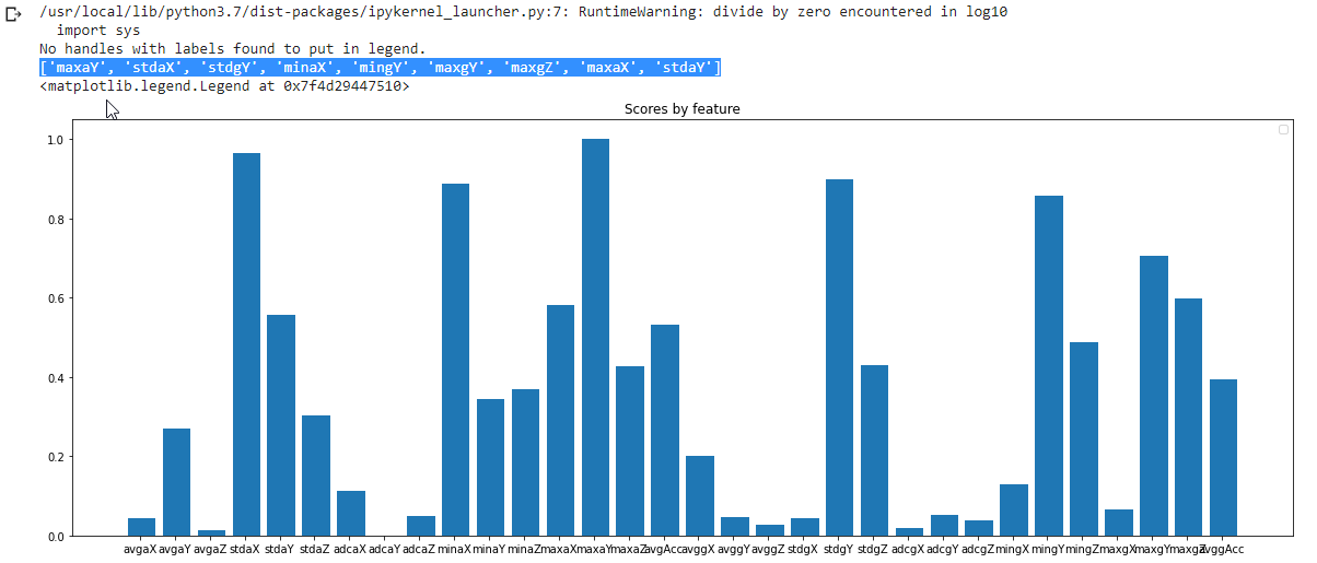 import numpy as np import matplotlib.pyplot as plt from sklearn.feature_selection import SelectKBest, f_classif # check which are the most promising featuresselector = SelectKBest(f_classif, k=2) selector.fit(fX_train, y_train) scores = np.where(selector.pvalues_ != 0, -np.log10(selector.pvalues_), 0) scores /= scores.max() fX_indices = np.arange(fX.shape[-1]) labels = ['avgaX', 'avgaY', 'avgaZ', 'stdaX', 'stdaY', 'stdaZ', 'adcaX', 'adcaY', 'adcaZ', 'minaX', 'minaY', 'minaZ', 'maxaX', 'maxaY', 'maxaZ', 'avgAcc','avggX', 'avggY', 'avggZ', 'stdgX', 'stdgY', 'stdgZ', 'adcgX', 'adcgY', 'adcgZ', 'mingX', 'mingY', 'mingZ', 'maxgX', 'maxgY', 'maxgZ' , 'avggAcc'] x = np.arange(len(labels)) indices = scores.argsort()[-16:][::-1] print(list(np.array(labels)[indices]))