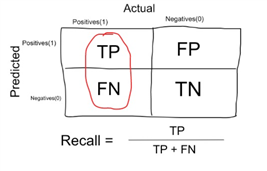 Recall | Proportion of true positives over total number of true positives and false negatives (i.e. model predicts 0 when it should have been 1) | sklearn.metrics.recall.score() tf.keras.metrics.Recall() |