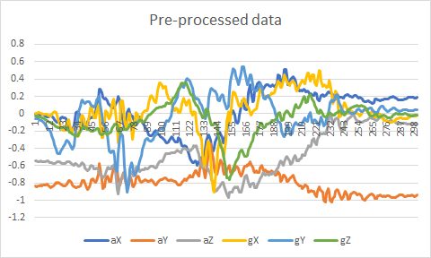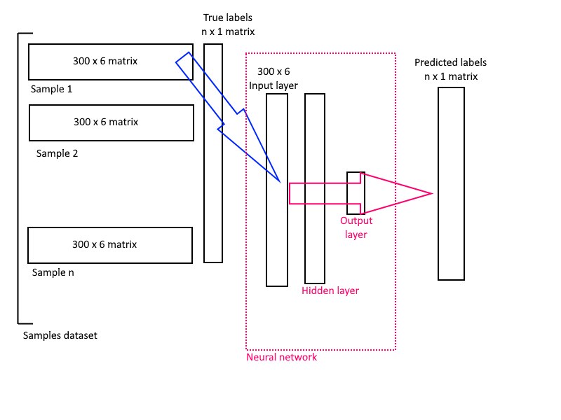 As I said, the input of the neural network are the accelerometer readings. Since we have 6 readings (3 linear accelerations and 3 angular accelerations) and we need to feed the network with readings over a given time window, the input will be a matrix of