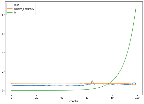 # Create a learning rate scheduler callback lr_scheduler = tf.keras.callbacks.LearningRateScheduler(lambda epoch: 1e-4 * 10**(epoch/20)) # traverse a set of learning rate values starting from 1e-4, increasing by 10**(epoch/20) every epoch # Fit the model (passing the lr_scheduler callback) hist = model.fit(X_train, y_train, epochs=100, callbacks=[lr_scheduler]) # Checkout the history pd.DataFrame(history.history).plot(figsize=(10,7), xlabel="epochs");