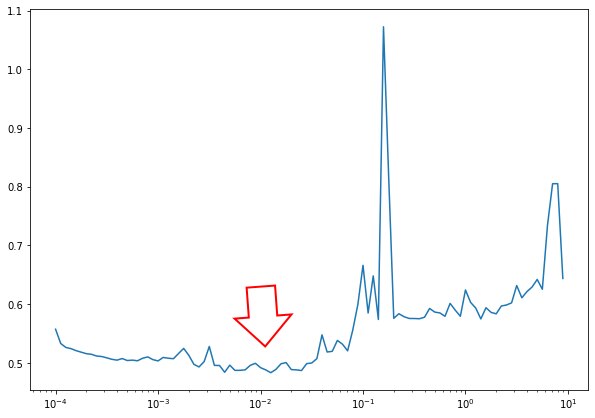 # plot the learning rate versur the loss lrs = 1e-4 * (10 ** np.arange(100)/20)) plt.figure(figsize=10,7)) plt.semilogx(lrs, hist.history(["loss"])