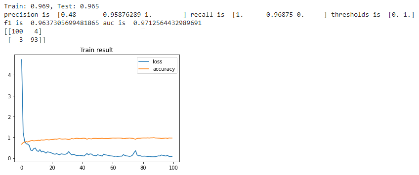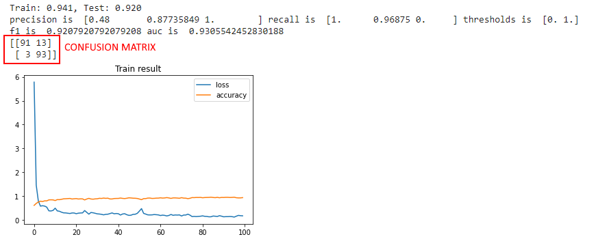 Keras does not include metrics like precision, recall or F1-score, but all these metrics can be easily checked with just a few lines of code by running the metrics provided by the Scikit-learn API.