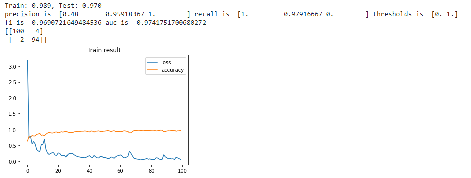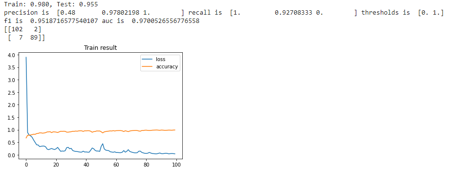 # evaluate the model train_acc, train_loss = model.evaluate(fX_train, y_train, verbose=0) test_acc, test_loss = model.evaluate(fX_test, y_test, verbose=0) print('Loss - Train: %.3f, Test: %.3f' % (train_loss, test_loss)) # compute precision, recall, F1-score from sklearn.metrics import precision_recall_curve from sklearn.metrics import f1_score from sklearn.metrics import auc import seaborn as sns y_predict = model.predict(fX_test) y_predict_labels = np.round(y_predict) precision, recall, thresholds = precision_recall_curve(y_test, y_predict_labels) f1 = f1_score(y_test, y_predict_labels) auc = auc(recall, precision) print("Precision: ", precision[1]) print("Recall: ", recall[1]) print("F1-score: ", f1) print("AUC: ", auc)