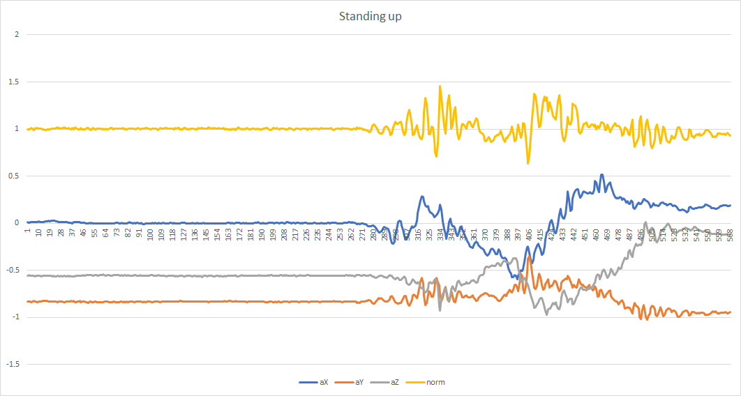 - comparing before and after: after a fall, the individual’s body will be in a different orientation than before, so the static acceleration in three axes will be different from the initial status before the fall. Suppose that the fall detector is belt-wired on the individual’s body, to provide the entire history of acceleration, including the initial status. We can read the acceleration data in all three axes and compare those sampling data with the initial status. In figure, it is evident that the body fell on its side, since the static acceleration has changed from –1 g on the Y axis to +1 g on the Z-axis. So the fourth basis for determining a fall is if the difference between sampling data and initial status exceeds a certain threshold, for example, 0.7 g.