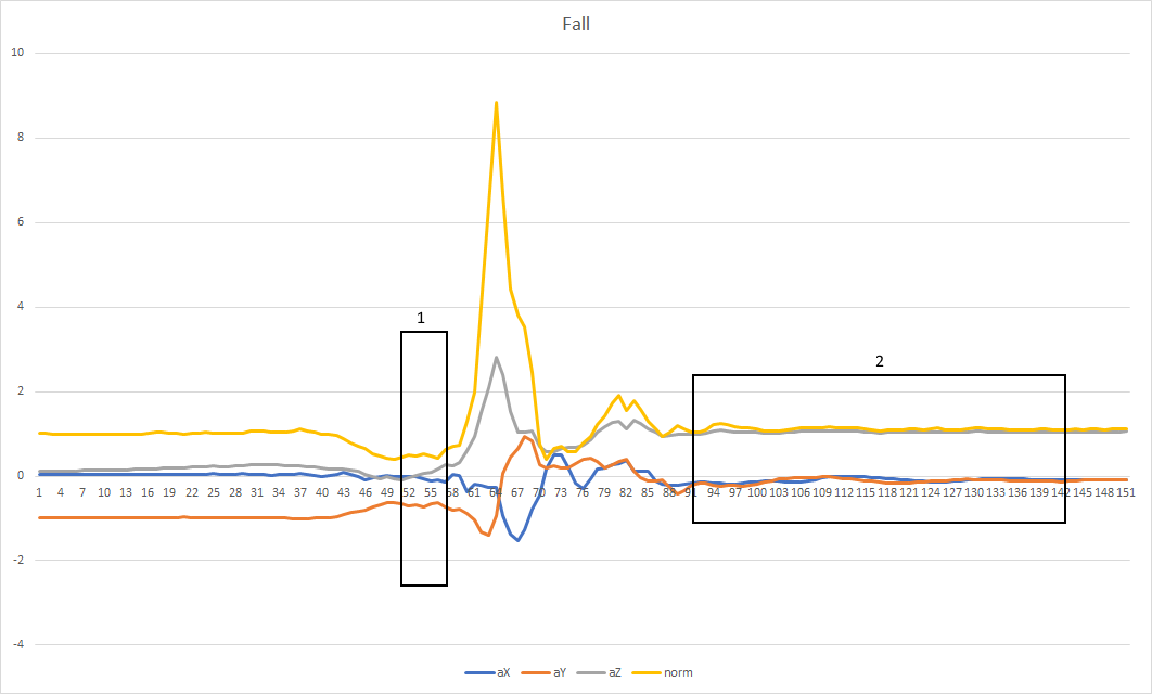 - impact: between the "start of the fall" and the "aftermath" phases, the human body will impact the ground or other objects; the acceleration curve shows this as a large shock.