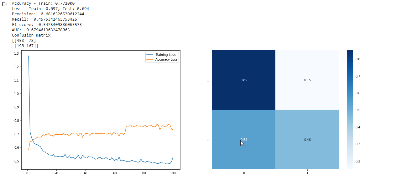The only neural network I was able to run on the Arduino Nano 33 IoT board was a neural network with just 4 feature and 10 nodes in the hidden layer. These are the metrics for such a neural network