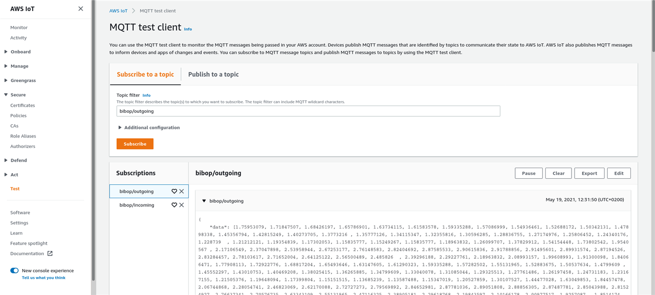 payload=pred_json)What we do here is read the data from the JSON file and create a NumPy array from it, preprocess it to fit the model input (extract features) and finally feed the model with the data. After the model infers the Systolic and Diastolic Blood Pressure the MQTT message is published on an incoming topic which is listened to by the BIBoP device.