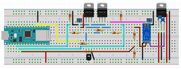 Having started out with the 5V based Arduino Nano, I needed to make some adjustments to make my circuit work with the Nano33, which runs at 3.3V. I thought I would have to adjust the voltage dividers, but at a ratio of 10:1 (100kΩ and 10kΩ resistors), they leave me with a maximum input voltage of 36.3V, which is more than enough.