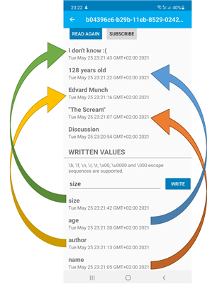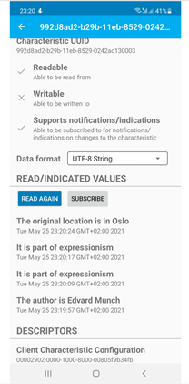 - I tested the Bluetooth Low Energy (BLE) connection between the Arduino Nano 33 IoT board and an Android smartphone. Using the ArduinoBLE library, I created a Sanity Check program. In this program, the Arduino Nano 33 IoT board acts as a Peripheral device and the Android smartphone as a Central device. The Arduino defines a service with a String type characteristic. This String characteristic is an undocumented but available part of the ArduinoBLE library (check the GitHub repository of the library and this example). The characteristic is readable and can provide notifications when the values are changed. The content of the this characteristic is changed between 2 predefined messages every 10 seconds. The size of the String characteristic is set to 512 bytes but the notification payload can handle only 20 bytes of payload. So, when the notification mechanism is enabled on the smartphone, the received message is truncated if it is too long. For reading the full message, the classic reading should be triggered.