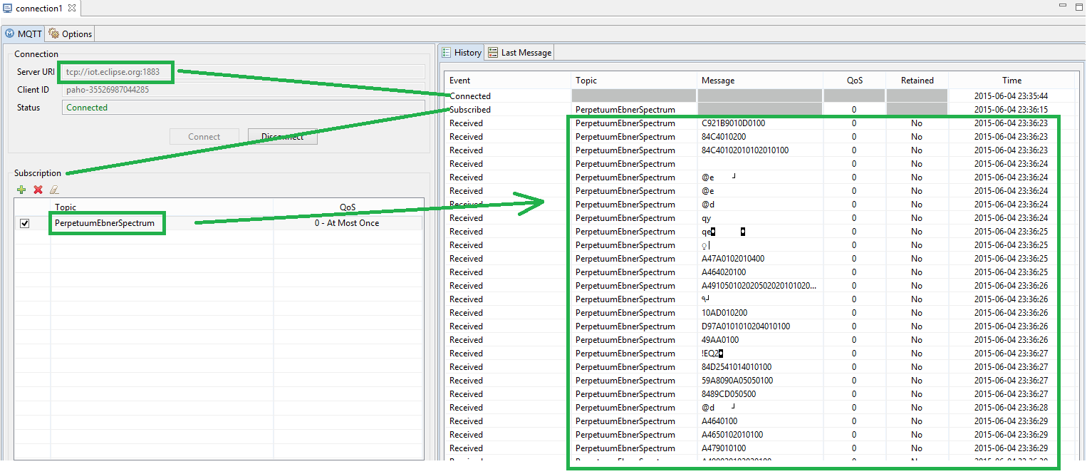 I subscribed to my data with eclipse PaHo client. The screen capture above shows the received data. It's normal that the characters don't display right, because the payload isn't text. It's 64 8-bit nuggets of info.