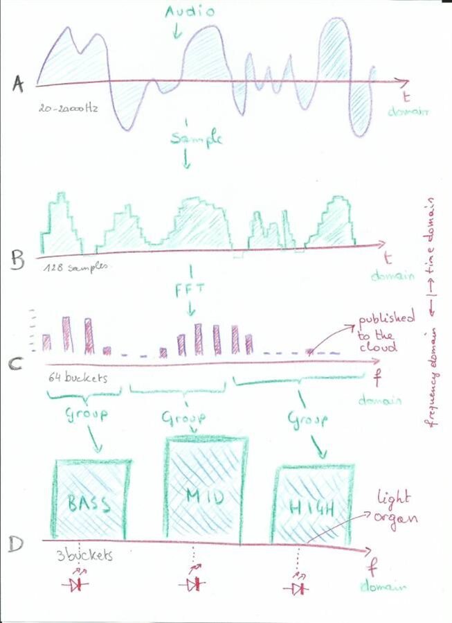 - Those 64 buckets grouped into a Bass, Mid and High range (signal D). That's the info that drives the LEDs of the light organ.