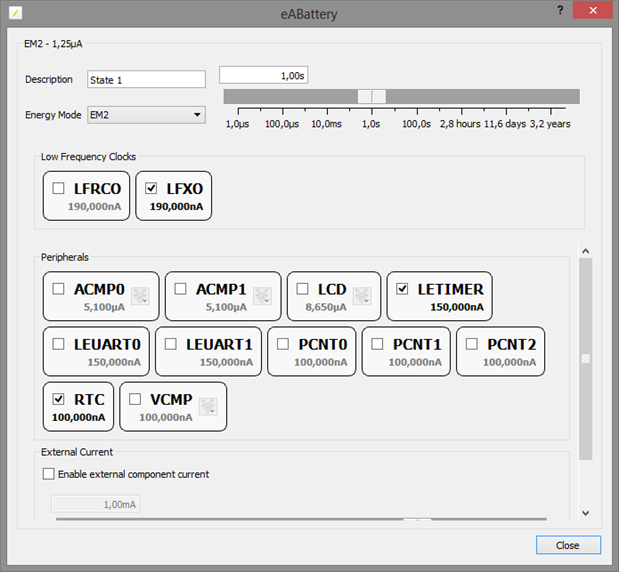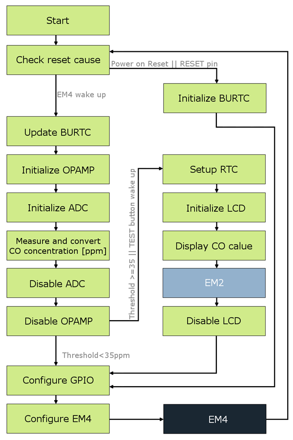 If the value of concentration is less than a 35 ppm threshold, the value is not being displayed. But, if it is 35 ppm and more or the wake up was caused by the TEST button, the RTC is being configured to count the duration of displaying the value in ppm on the LCD. The LCD driver is being initialized, the value is displayed and the chip goes into EM2 mode for the time of displaying to save energy. After some short period of time, the RTC wakes up the chip and the LCD driver is being disabled. Here is a tip for you. If you need to count time in EM3 mode, you can use the Low Energy Timer in EFM32 (with ULFRCO) instead of the RTC to save energy. My device have to stay in EM2, because of the LCD driver to I use RTC. I could also use Low Energy Timer in EM2 but it uses more current than RTC in this mode.