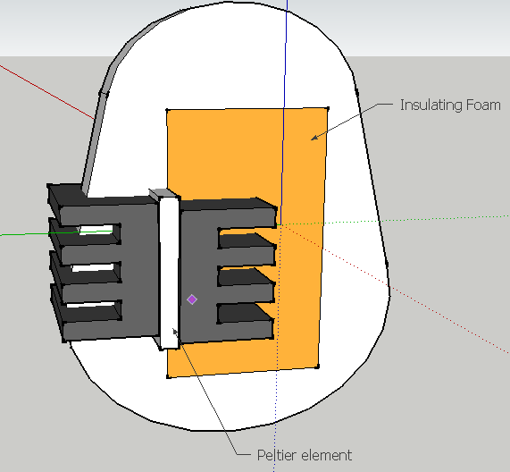The peltier element would harvest the energy from the temperature difference between water (rising to 100 degrees Celsius) and the insulating foam which would start out at room temperature. Inside the foam a PCB would be placed that would sense the water temperature, and an EFM32 would be able to calculate the 'hardness' of the egg.