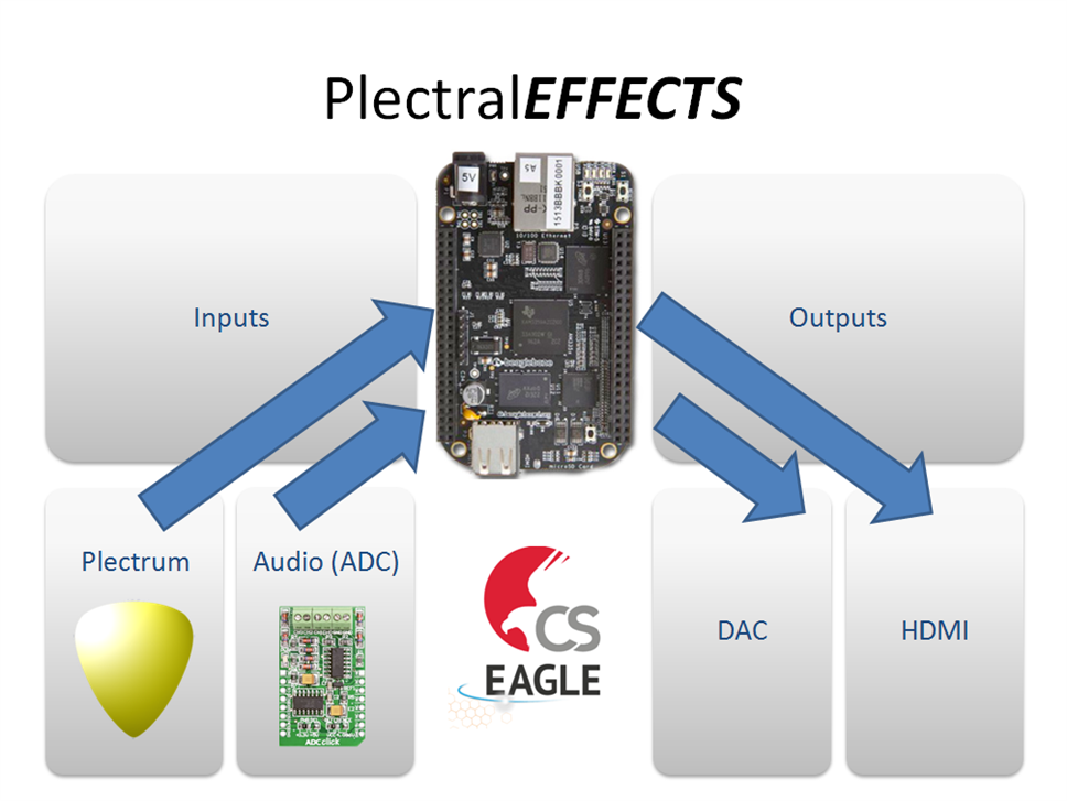 These DSP type effects will be generated by the Beagle Bone Black in realtime by making use of the unique Programmable Realtime Unit(s). This will require the production of C code to process audio data in realtime from ADC to DAC/HDMI.