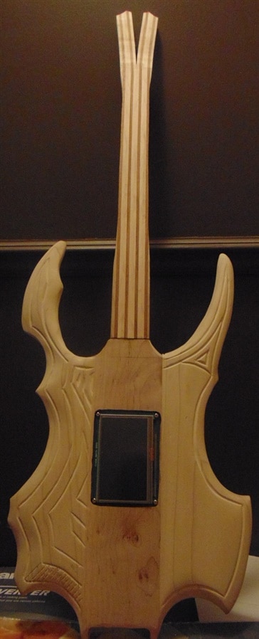 Here is a picture of the guitar I made with the LED screen inlaid into the body. I hand made and carved the guitar myself. The neck is made up of layers of solid Maple and Jatoba, the V at the top is made by bending the layers.