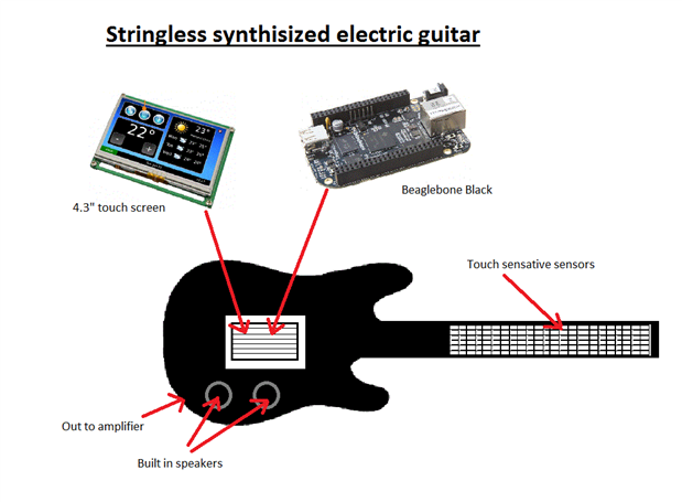 The Beaglebone Black from Texas Instruments will be the life of the guitar. I will have a 4.3" touch screen that will be used as the user setup and the virtual strings. Touch sensors will be used on the neck of the guitar to let the BBB know where your fingers are located. When you touch the sensors, like you would on an actual stringed guitar, it will change the tone when the virtual strings are strummed. Speakers will be used to produce the sound (or music if your good) as well the BBB will be user controlled to change the sound produced.