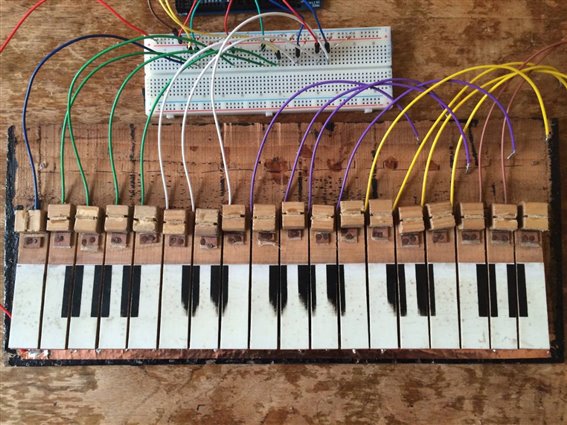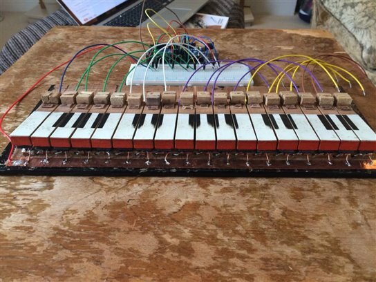 Here is a video of eight of the keys in action, wired up to an Arduino Mega board which is sending MIDI messages to Ableton Live software. There is no velocity or pressure sensitivity implemented yet, however notes of different lengths can be played, and it is fully polyphonic.