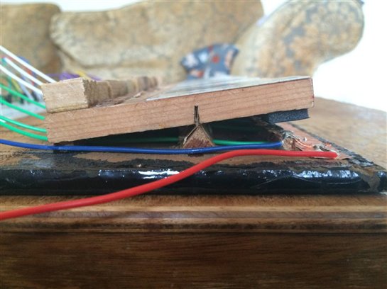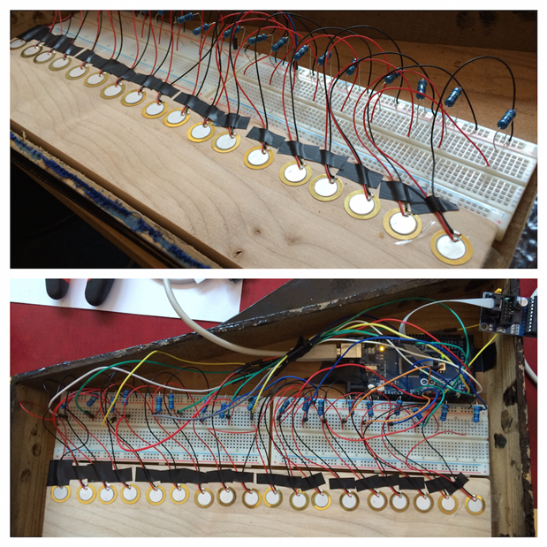 This circuit was stuck to the underside of the top of the piano to allow the keys hammers to strike the piezos.