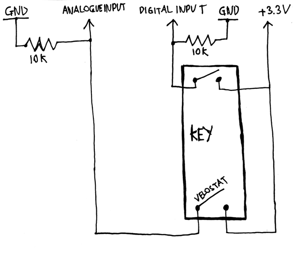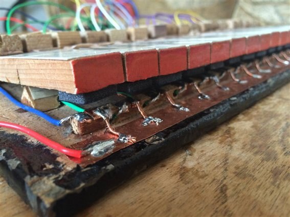 This is potentially a better solution than using existing sensors as it is a tried and tested method for electronic musical keyboards. As I need the touch sensitivity to be very sensitive I found I can't use any mechanical push switches/buttons here; even some membrane buttons I tried weren't sensitive enough. The best solution seems to be to just make the keys open and close circuits, acting in the same way that buttons/switches do.