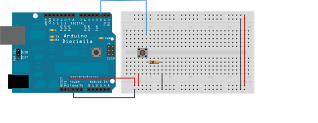 A button connected to an Arduino. Source: https://www.arduino.cc/en/Tutorial/Button