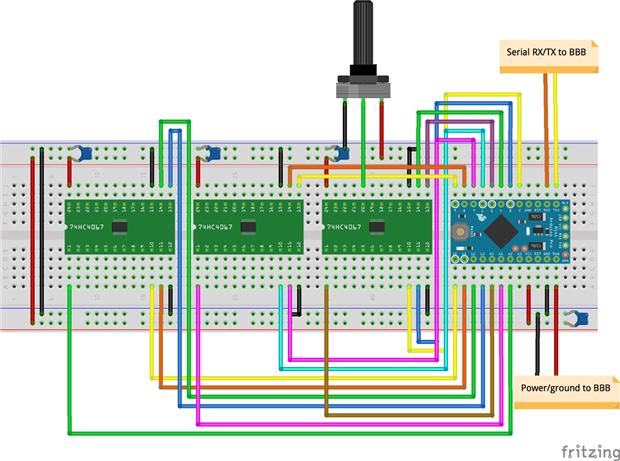 The completed circuit for the panel has been developed using stripboard which will be screwed to the underside of the panel using standoffs, using solid core wire to make all connections. Below is a breadboard diagram of the circuit but with only one potentiometer attached: