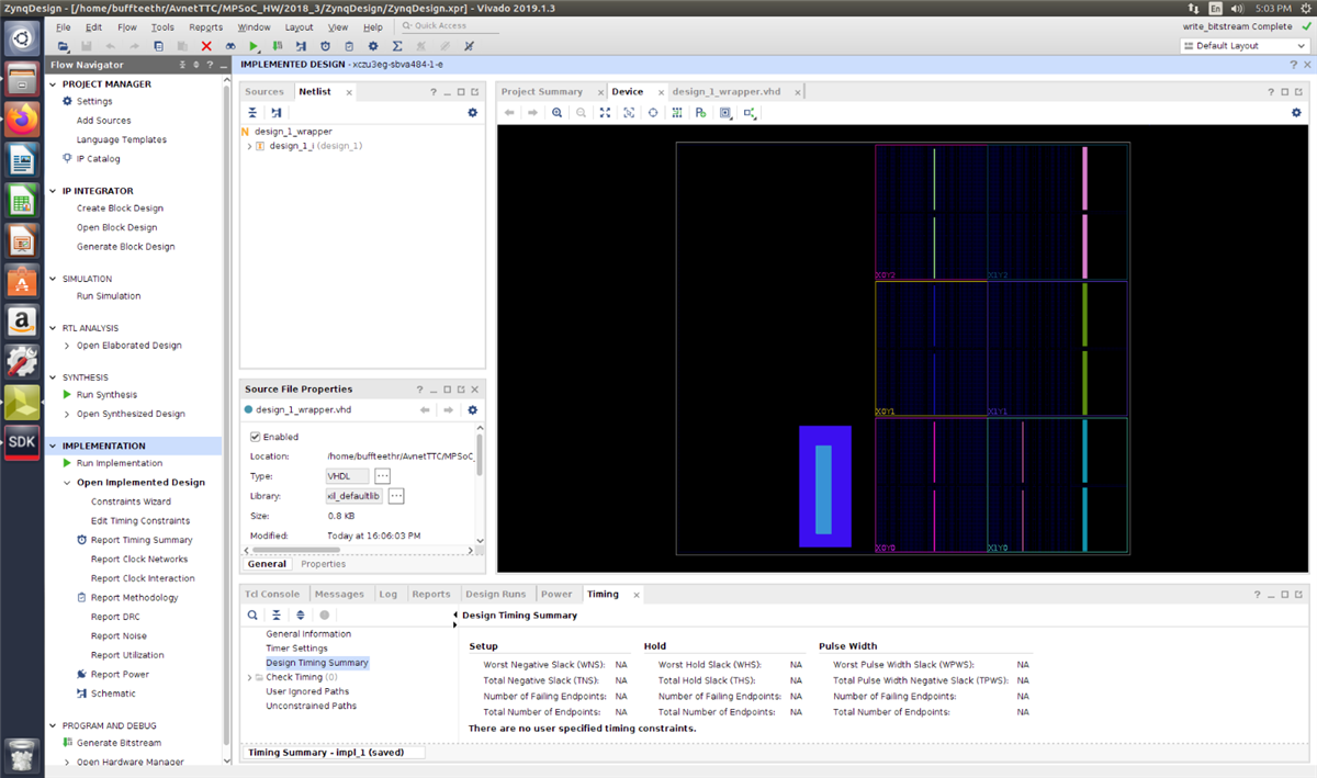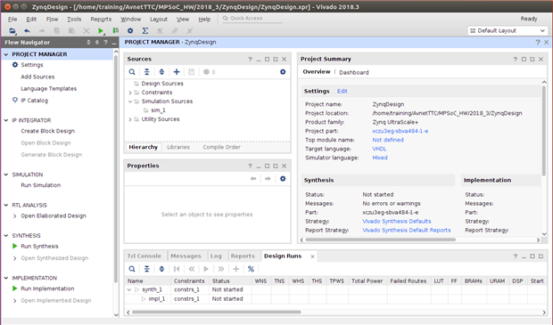 Lab 1: Vivado includes all the required tools for creating new FPGA and SoC designs as well as the Software Development Kit (SDK) for developing software. The Zynq MPSoC Processing System (PS) has a configurable set of built-in peripherals as well as direct access to Programmable Logic (PL) that can build any custom IP. The PS may be used without anything programmed in the PL. However, in order to use any soft IP in the PL, or to route PS dedicated peripherals to device pins in the PL, programming of the PL is required. The lab illustrated an example of how to create new Zynq projects using UltraFast Design Methodology within Vivado.
