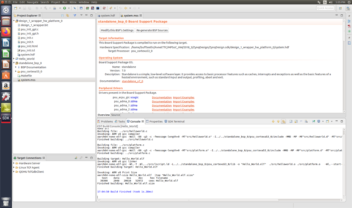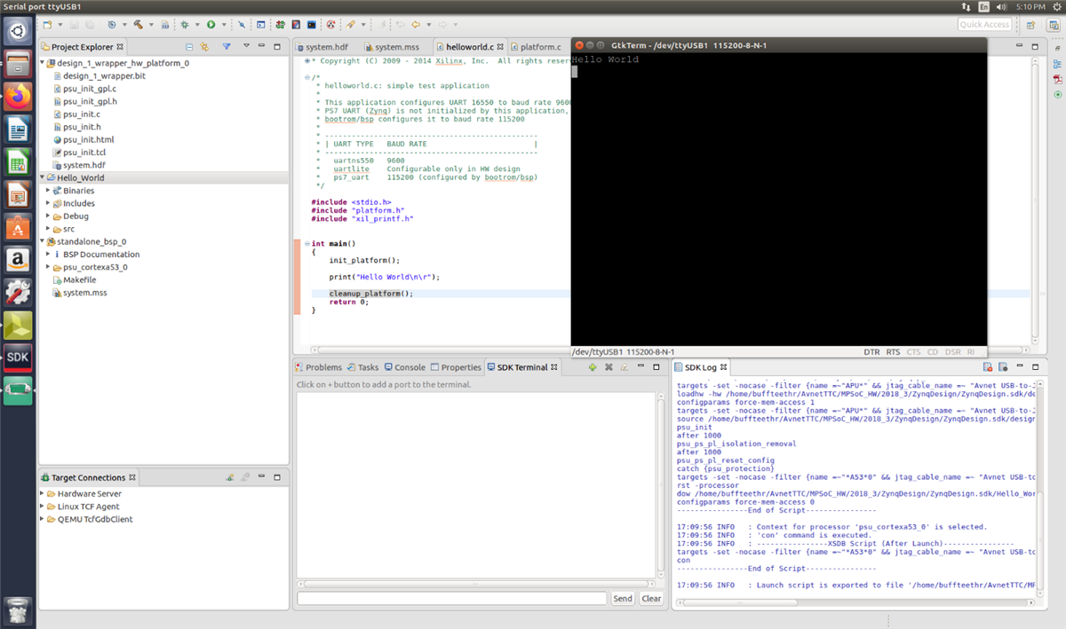 Lab 2 takes over where Lab 1 left off, in which an ARM Processing System was added to the IP Integrator block design. In this lab, I configured the processing subsystem by adding a UART peripheral, configuring internal clocking resources, and setting up our DDR memory controller. The design was then exported to the Software Development Kit (SDK) and a simple Hello World application was created.