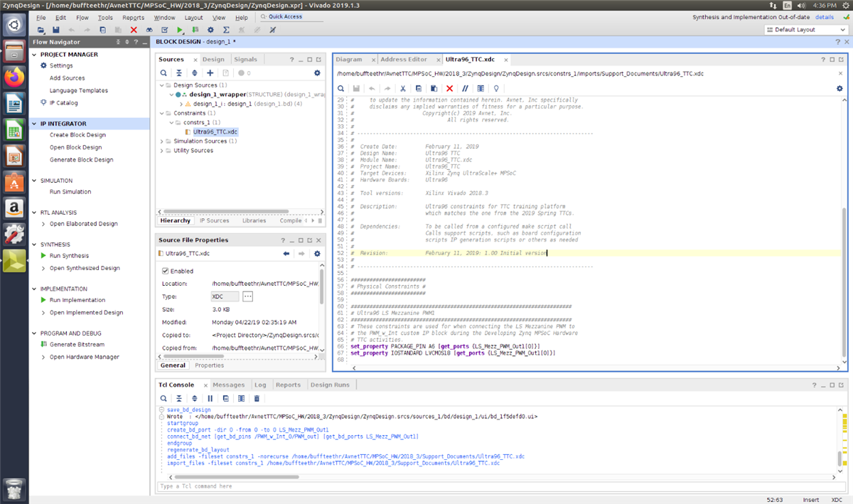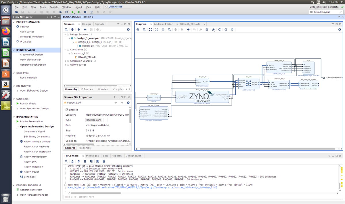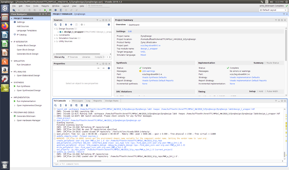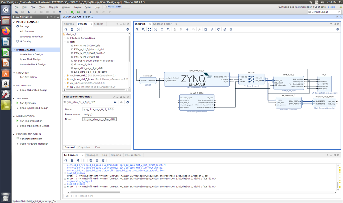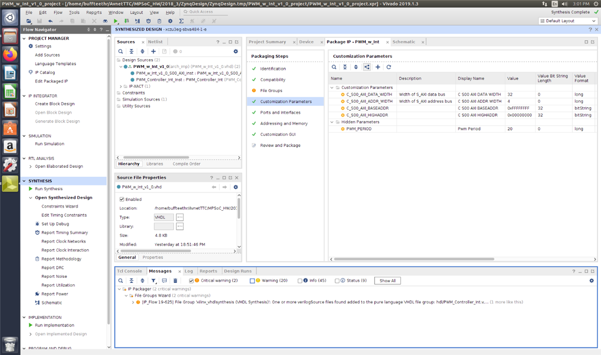 Vivado has large IP catalog which makes it very easy to connect many of the common interfaces to designs. This lab provided step-by-step instructions on how to create custom IP, add it to the IP catalog, and then connect it to a design. The IP that we added was a Pulse Width Modulation (PWM) controller. It takes clock, duty cycle, and period inputs to create a PWM output as well as a count output. The IP generates an Interrupt when an invalid PWM range is written into block. The PWM was used to control the back-light brightness on a 2x16 LCD on a Low-Speed (LS) Mezzanine on the Ultra96, which connected to a MikroE 96Boards Click Mezzanine, which connected to the LCD Mini-Click. In this lab I learnt how to: