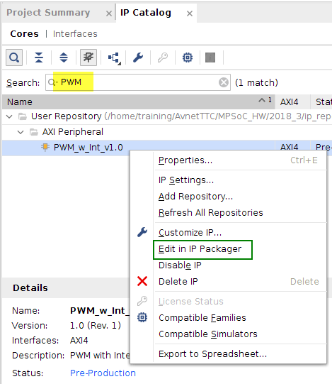 Once the Custom IP was added to the repository I was able to edit it in the IP packager.
