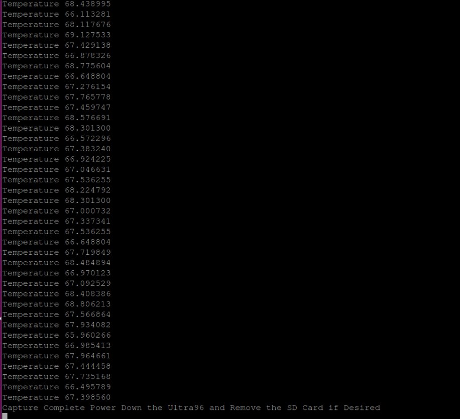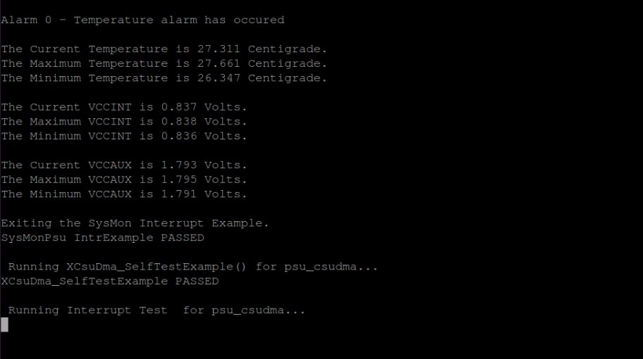 We used the readings of the internal temperature sensor and an ADC to test the capabilities of the xilffs library. I did not have any issues with running the application and the temperature readings were displayed in the terminal as well. However, I noticed that the fan on the board is working non-stop and Ultra96 gets quite hot – even though the application is not really “heavy”, the temperature reached 63 degrees C. Some components on the board like the USB ports were heated quite badly as well.