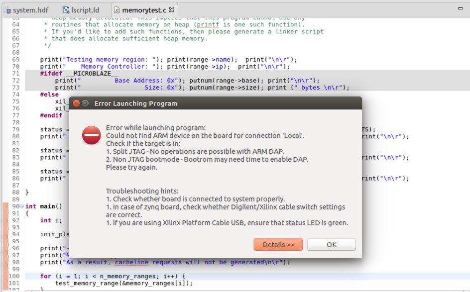 However, I had some issues with loading the Hello World application to the board with error message shown in Figure 1. The possible issues listed there were not applicable in my case – so I just relaunched the run. The error message did not appear anymore, and FPGA programming was initiated as expected.