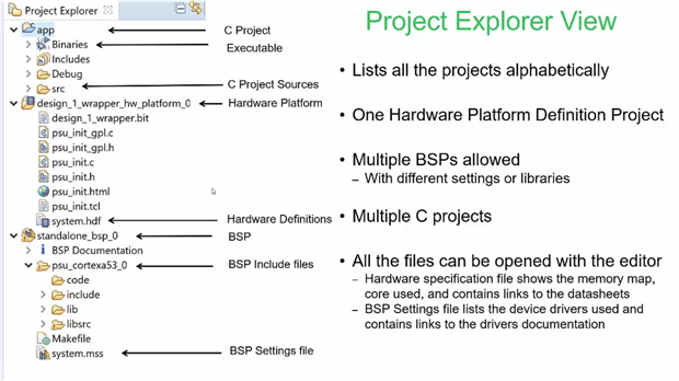 - Project Explorer shows you all the hardware platforms, BSPs & applications in your workspace