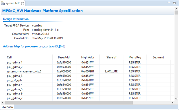 - Had a look at how SDK interprets the hdf file - it displayed the address map, recognized the IP blocks we added and even displayed the register map for Xilinx IP.