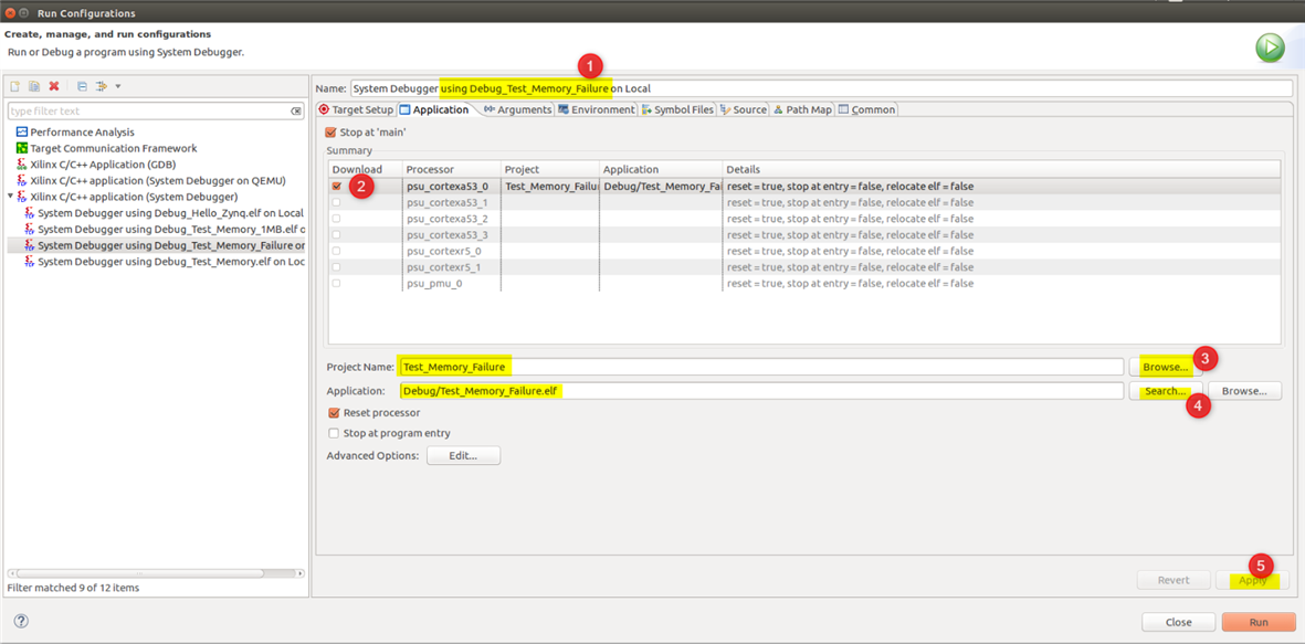 Thus, I have to manually modify those settings as shown in the screenshot below (this is the example for Test_Memory_Failure application)