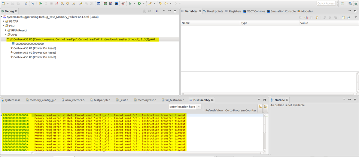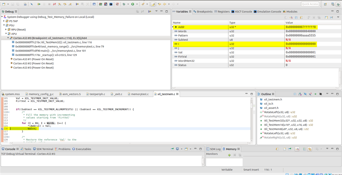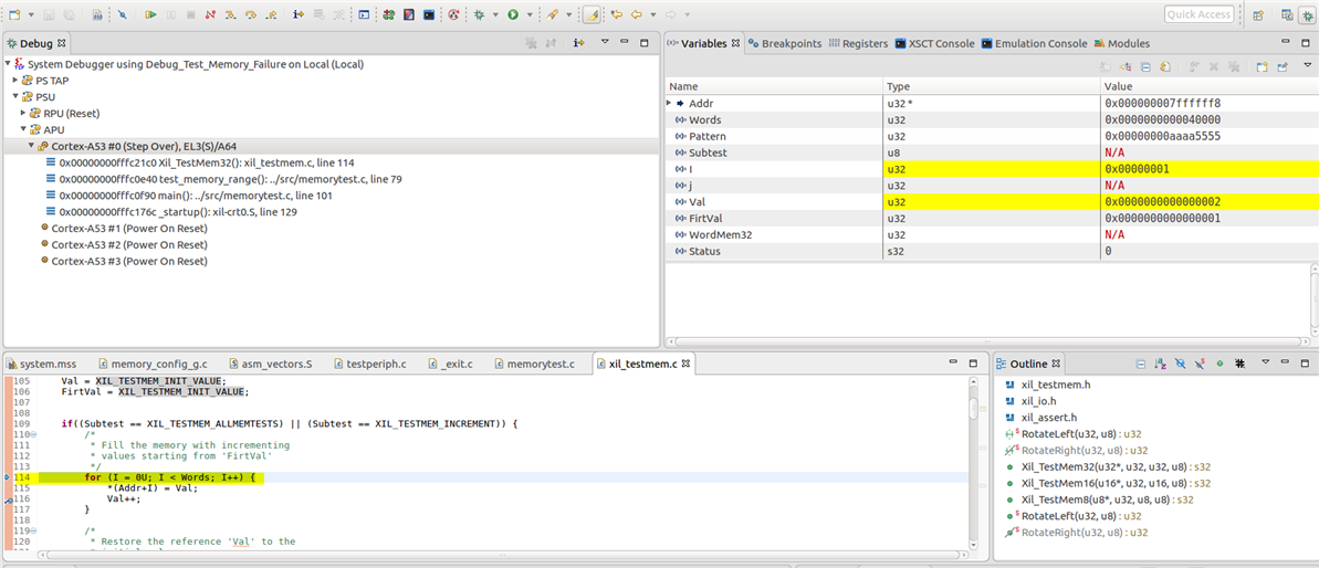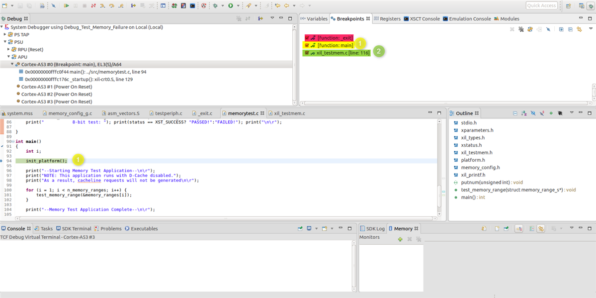 Let's start the debugger, I created a breakpoint at line 116 in xil_testmem.c file where the actual memory access occurs. There are two default breakpoints created by SDK. One is the automatic stop point in main() after the debugger is launched. The other one is in the _exit() function when main() function returns to the standalone OS.