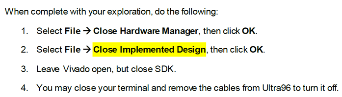 HW Lab 8, page 22, there's no menu items called "Close Implemented Design". I think it really means "Close Project".