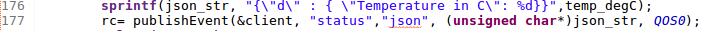 Answer to the question at the end of Lab 5: line 176 creating the string data to send to the IBM Bluemix server using MQTT protocol. Line 177 sends that data.