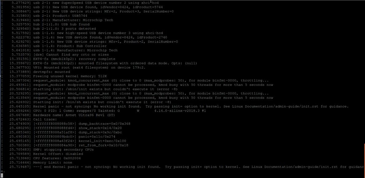 After creating the SD card, the first boot failed because of kernel crash (see the last line of the following screenshot). After going through the console message, I realized I didn't issue command