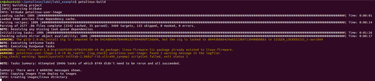 I followed the lab instructions and built my own image. It downloaded lots of files (shows 3501 files) when execute petalinux-build command. It took more than an hour to complete the build. It takes 34.5GB disk space in total.