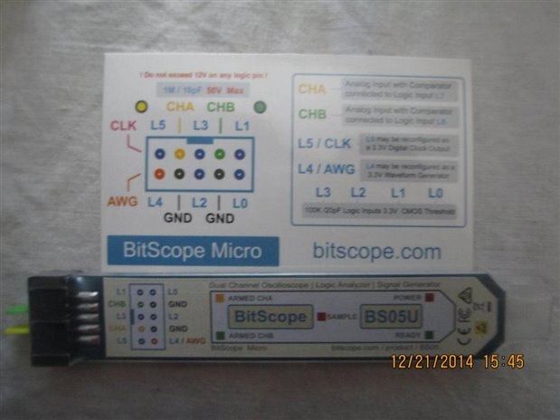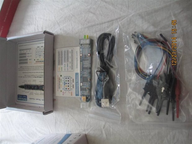 Then, there's BitScope. Its packaging is quite good. Beware - you don't get any analog additions with it, like breakout for BNC and analog probes. Seems like you need to get them separately, should you want to debug something analog. =( Doesn't seem to be much of a problem, as you can easily make your own adapter for scope probes using just a BNC socket which I happen to have. They have a quite nice digital probes and USB cable, and the scope seems to be fit for forgetful people like me, it has 2 cheatsheets - one printed on the scope itself, one on a separate cardboard sheet. Nice! I've always wanted a logical analyzer + protocol decoder, and this evening I've understood how it works and successfully have decoded UART messages. If anybody needs help, I can make a guide - it was kinda tricky as I still haven't spotted any nice guide for BitScope Logic software.
