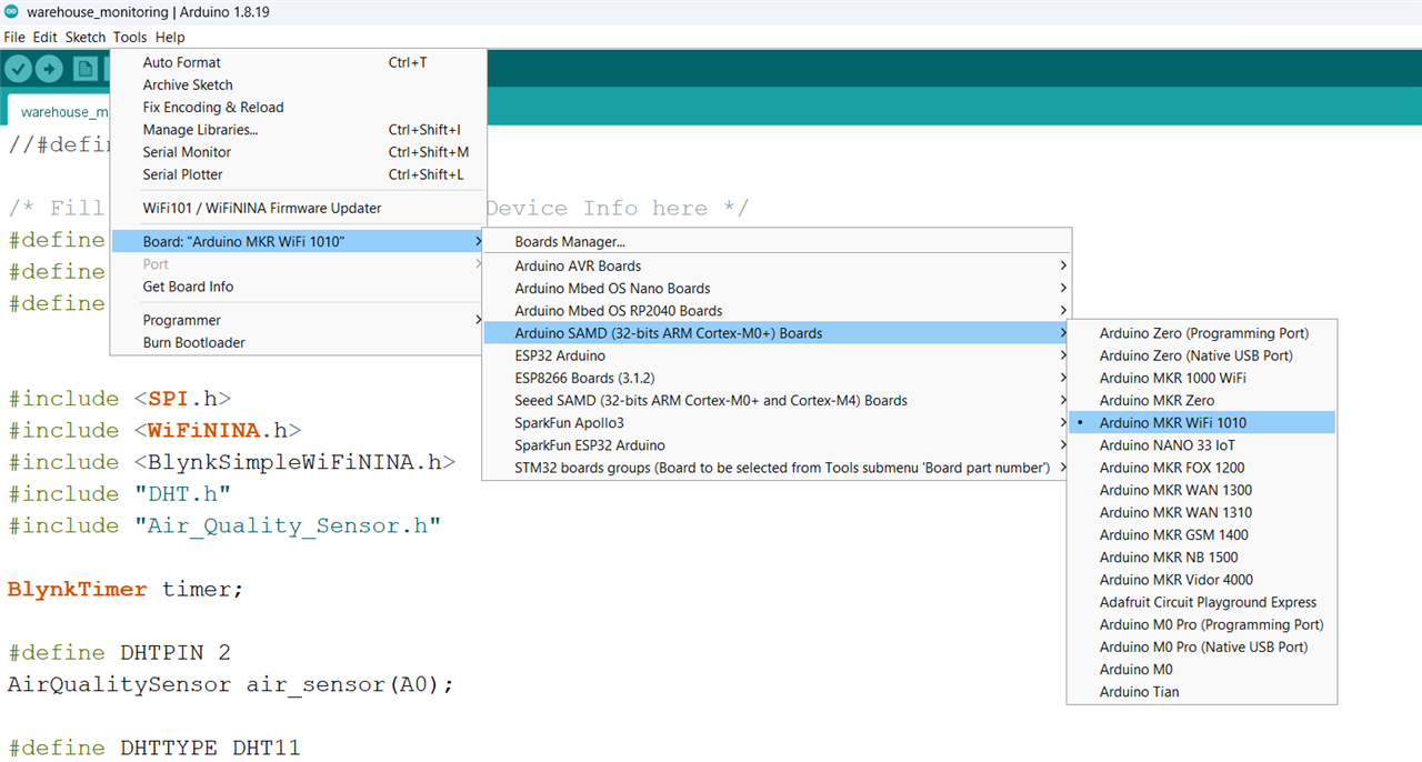 Then for programming I started with the example program for Arduino MKR 1010 board that was included in the Blynk library. I made all the necessary modification in the code and uploaded the code to the Arduino MKR board.