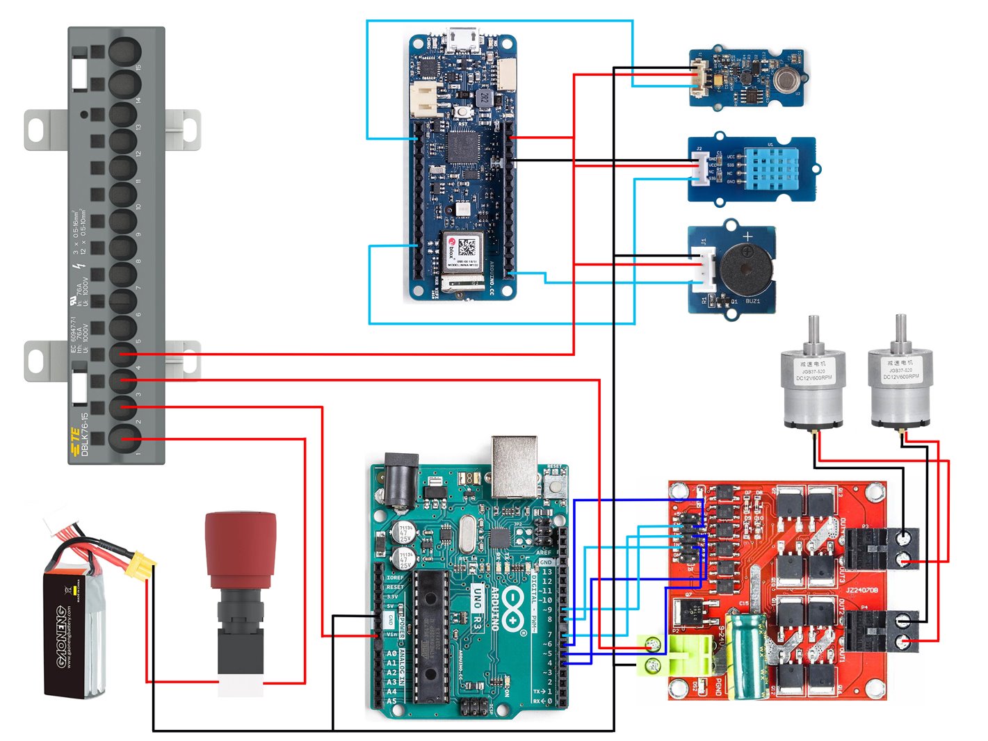 Then, I distributed the power to the motor driver board, and two Arduino boards. The power is in to the distribution block using TE Emergency switch.