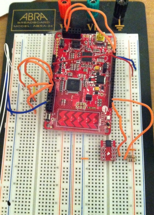 The hardware as it currently stands is shown in the picture below. Right now it is on a breadboard because I am awaiting a shipment of batteries and a battery holder to make this an enclosed project (as best I can). The dual white wires on the left are the thermistor (you can see the thermal "bulb" near row 55 on the breadboard). The lower right hand corner shows the FRAM. It is quite tiny, and you can see its I2C pull up resistors.