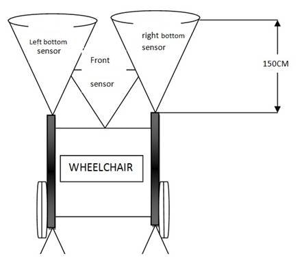 My Wheelchair project needs obstacle detection along the travel path of the wheelchair. It is also needed to see that the floor is even and to detect stairs and dead ends of the floor for safety. Three sensors are planned for this purpose. The positions of the sensors are as shown below: