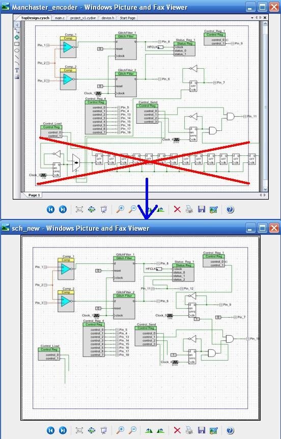 So the difference between the logic “1” and logic “0” bits is not the modulated pulse position within a cycle, like for Mancester decoder, and it is not the length of the modulated pulse. Logic “1” bits have longer spacing in between than logic “0” pulses, and all LED_ON pulses have the same length (1/2 cycle). I have tried to think of a way to transform my shift register that I built one week ago to generate this sequence of pulses, but I couldn’t find an easy way since basically I had to create logic “1” pulses with different clock period than logic “0” pulses. So I decided to remove the shift register and instead to build a subroutine in the CPU that creates these pulses using the CyDelay(x) command. So my schematic has changed: